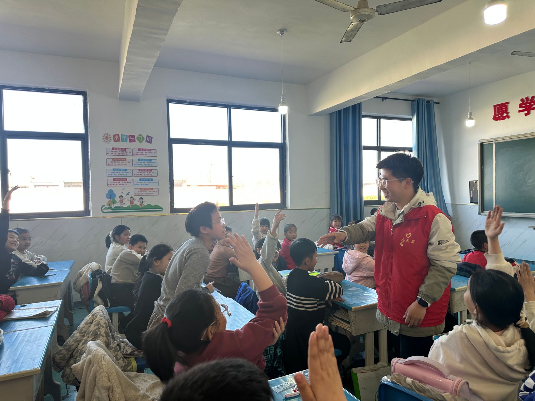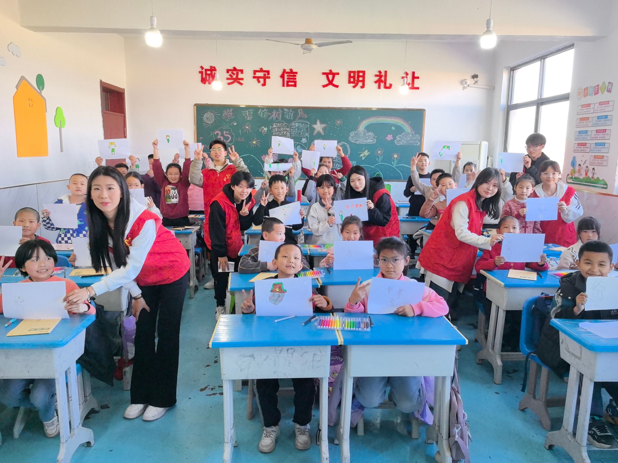 “学习雷锋好榜样,忠于革命忠于党,爱憎分明不忘本……”藁城区张家庄镇赵庄村小学三年级(1)班教室传出阵阵歌声,这里正在进行一场别开生面的“追锋”红色课堂。近日,网络与通信工程系宣讲小组的志愿者们用“青言青语”为同学们创新演绎雷锋精神,架起红色传承的桥梁。