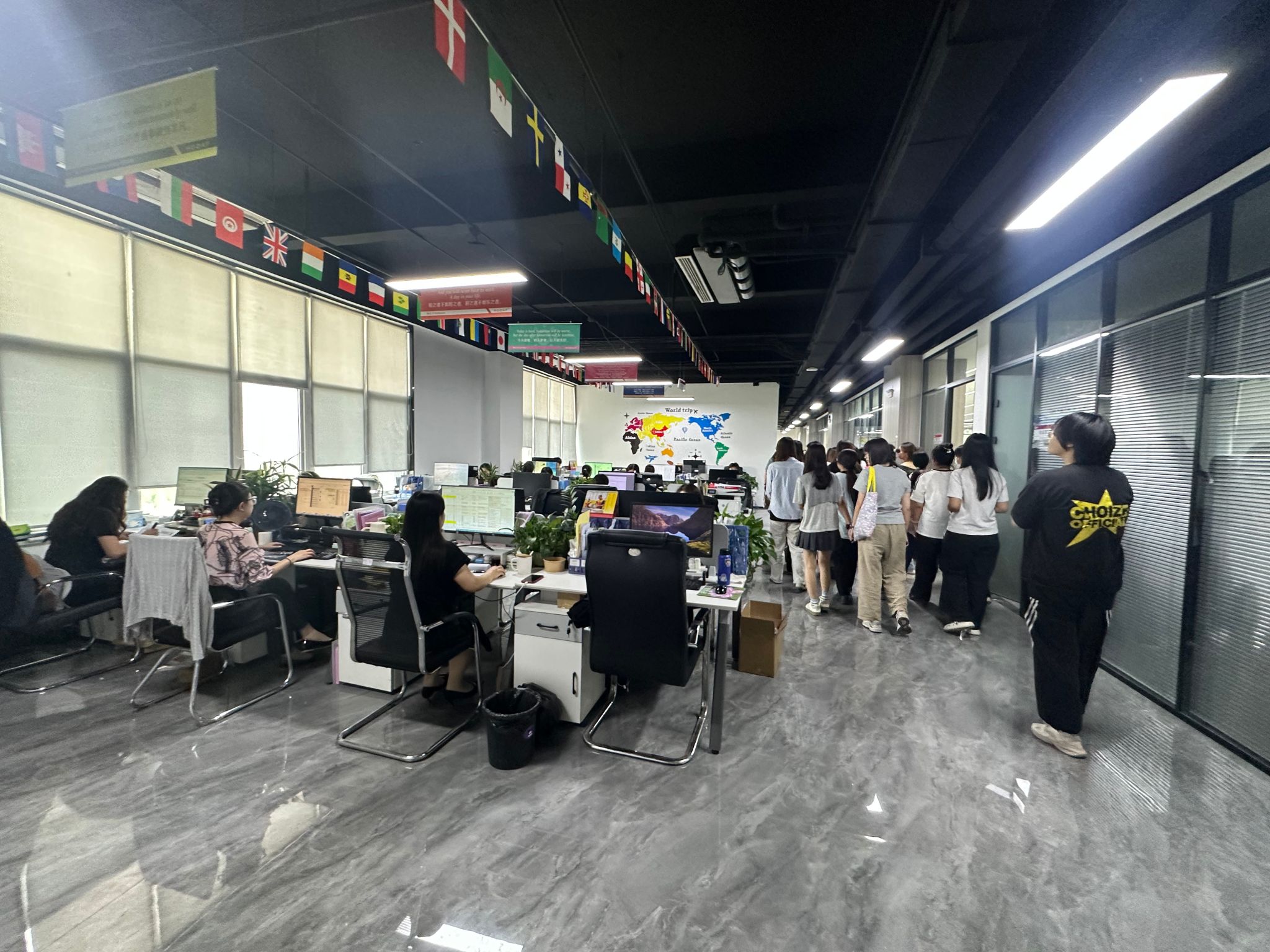 认知实习的第一站是企业办公场所。在负责人张聪聪的组织下,学生依次到市场部、研发室、外贸办公区、内贸办公区、展厅等区域进行学习。每到一处,企业专家均详细介绍部门概况、主营产品及各部门职能,使师生们对企业的整体架构及业务范围有了明确的认识。