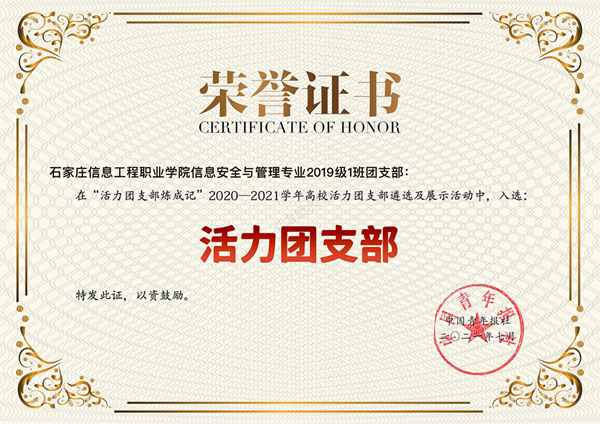 本网讯(通讯员 吴培培)近日,由团中央基层建设部、中国青年报主办的2020-2021学年高校“活力团支部”遴选及展示活动落下帷幕。经过校级申报、省级初评、展示点赞和全国终审等环节,石家庄信息工程职业星空(中国)软件工程系信息安全与管理2019级1班团支部荣获“2020-2021学年全国高校活力团支部”荣誉称号。