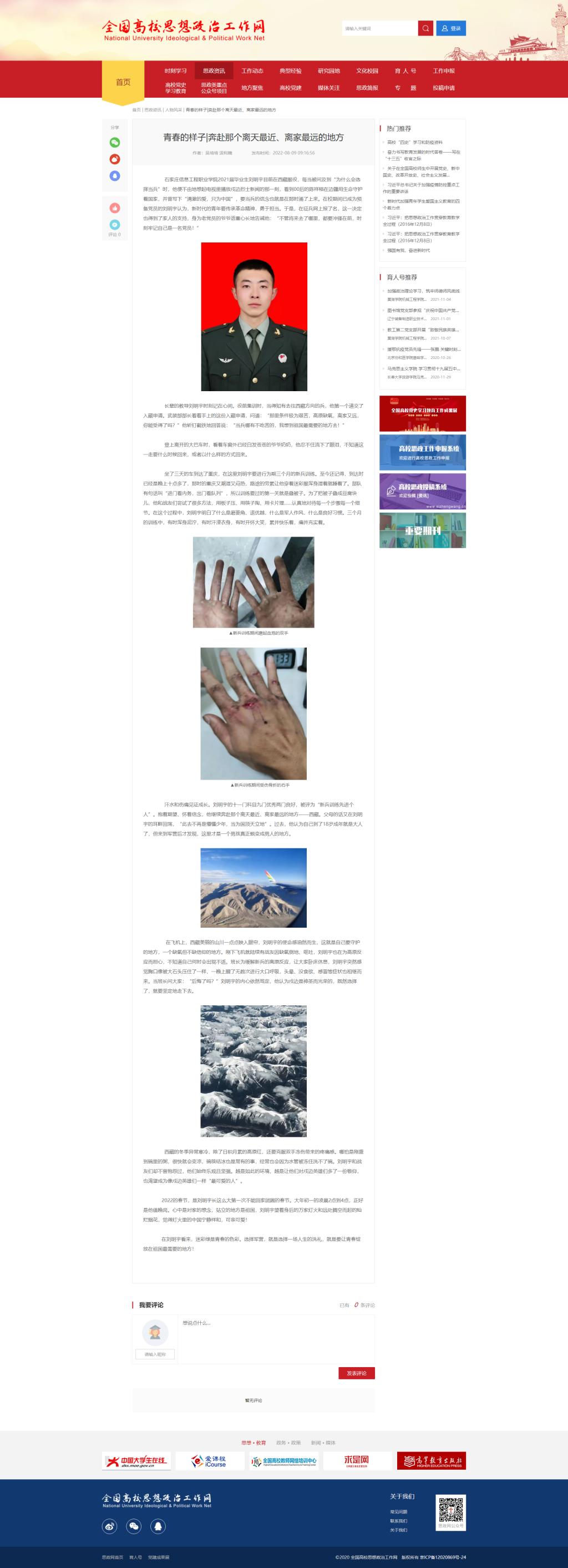 石家庄信息工程职业星空(中国)2021届毕业生刘明宇目前在西藏服役,每当被问及到“为什么会选择当兵”时,他便不由地想起电视里播放戍边烈士新闻的那一刻,看到00后的陈祥榕在边疆用生命守护着国家,并曾写下“清澈的爱,只为中国”,要当兵的信念也就是在那时涌了上来。在校期间已成为预备党员的刘明宇认为,新时代的青年要传承革命精神,勇于担当。于是,在征兵网上报了名,这一决定也得到了家人的支持,身为老党员的爷爷语重心长地告诫他:“不管将来去了哪里,都要冲锋在前,时刻牢记自己是一名党员!”
