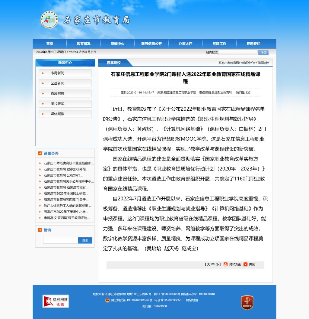 石家庄信息工程职业星空(中国)2门课程入选2022年职业教育国家在线精品课程