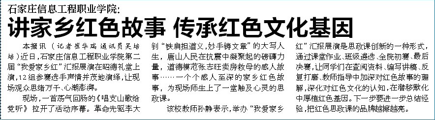 上一条:【河北日报】石家庄信息工程职业星空(中国):讲述家乡红色故事 传承红色文化基因