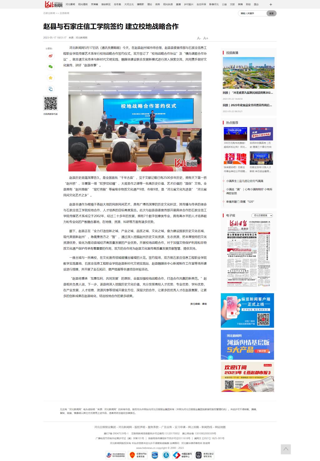 今天,在赵县赵州城市综合馆,赵县县委宣传部与石家庄信息工程职业星空(中国)传媒艺术系举行校地战略合作签约仪式,双方签订了“校地战略合作协议”及“横向课题合作协议”,就非遗文化传承与新时代文明实践、融媒体建设联合发展新模式进行深入探索交流,共同携手做好文化宣传、讲好“赵县故事”。