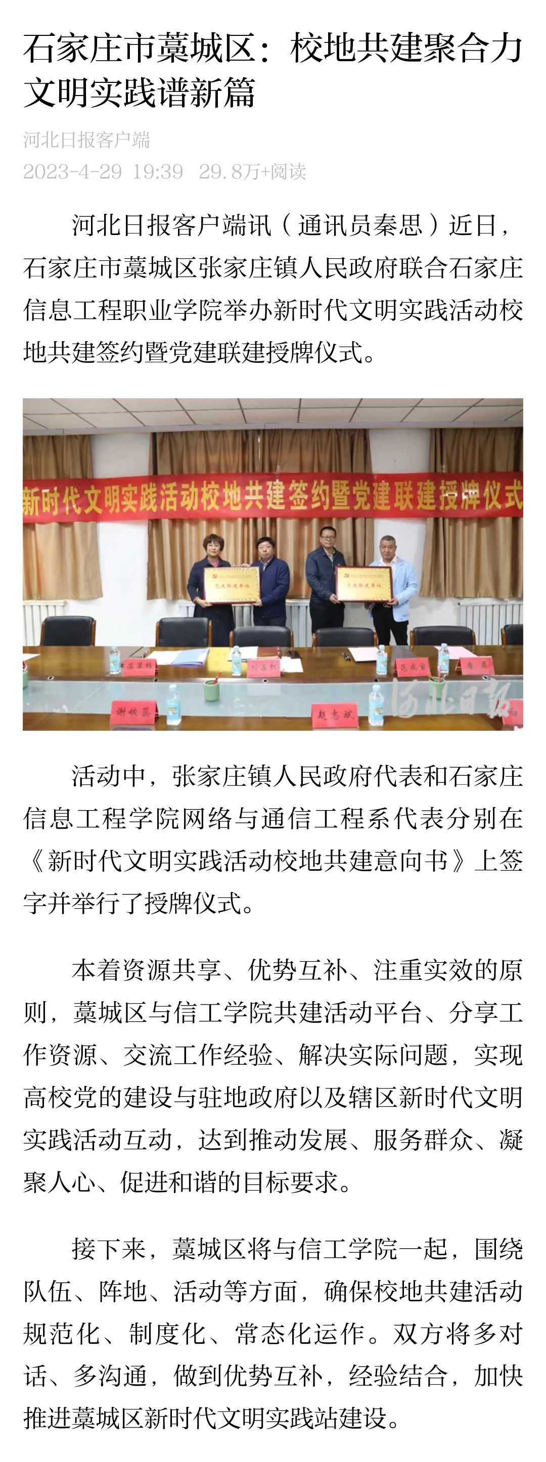 近日,石家庄市藁城区张家庄镇人民政府联合石家庄信息工程职业星空(中国)举办新时代文明实践活动校地共建签约暨党建联建授牌仪式。