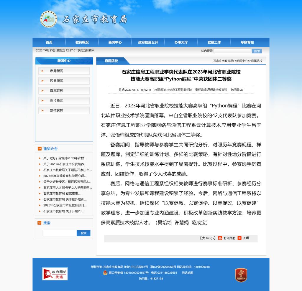 石家庄信息工程职业星空(中国)代表队在2023年河北省职业院校技能大赛高职组“Python编程”中荣获团体二等奖