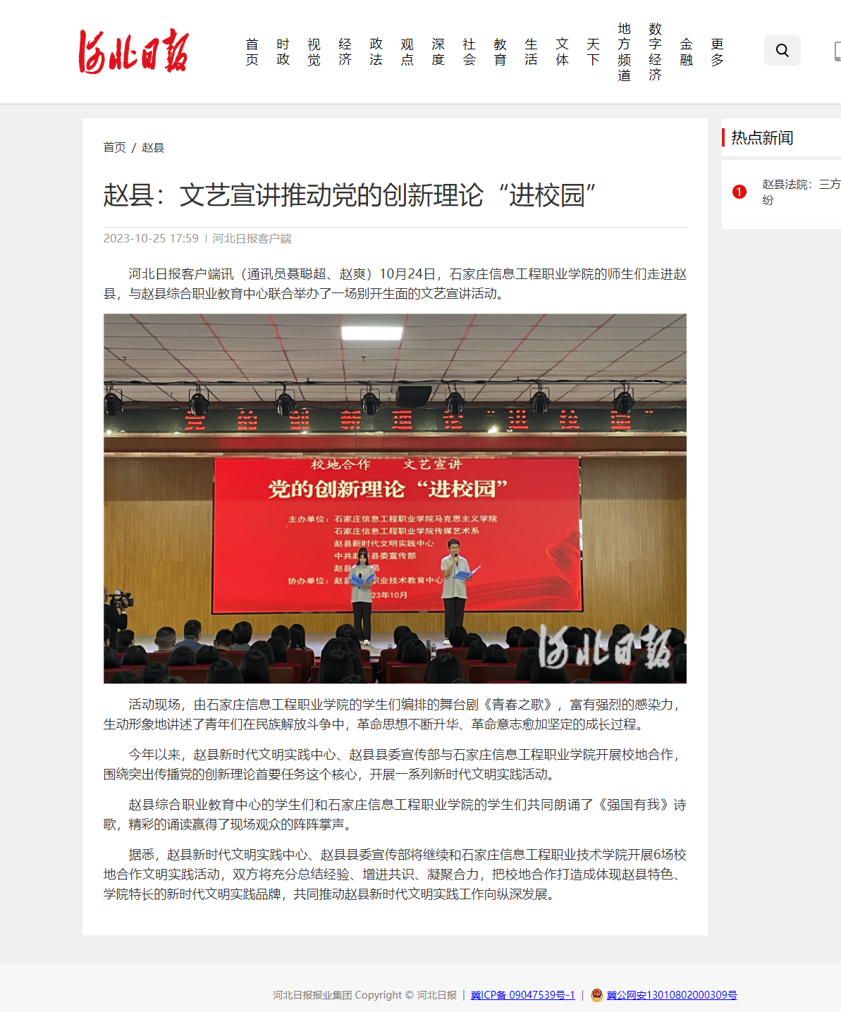 今年以来,赵县新时代文明实践中心、赵县县委宣传部与石家庄信息工程职业星空(中国)开展校地合作,围绕突出传播党的创新理论首要任务这个核心,开展一系列新时代文明实践活动。