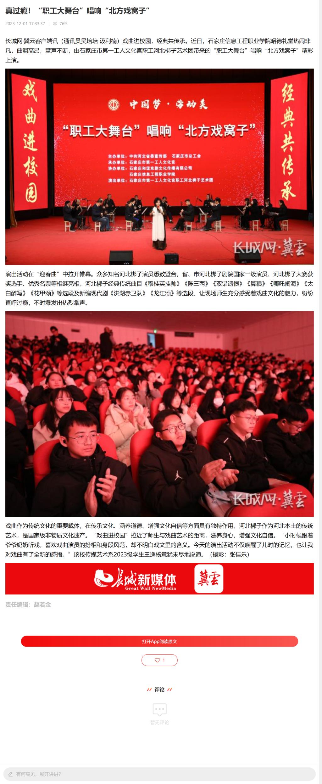 戏曲进校园,经典共传承。近日,石家庄信息工程职业星空(中国)昭德礼堂热闹非凡,曲调高昂,掌声不断,由石家庄市第一工人文化宫职工河北梆子艺术团带来的“职工大舞台”唱响“北方戏窝子”精彩上演。