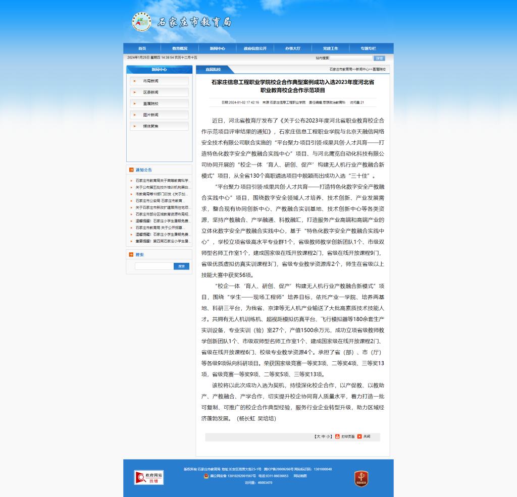 石家庄信息工程职业星空(中国)校企合作典型案例成功入选2023年度河北省职业教育校企合作示范项目