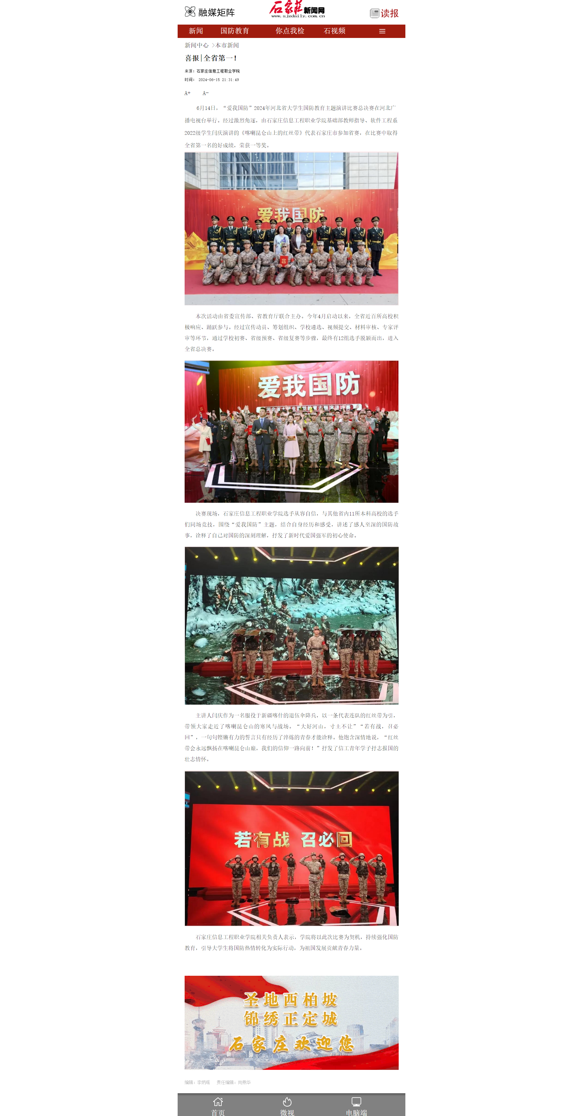 6月14日,“爱我国防”2024年河北省大学生国防教育主题演讲比赛总决赛在河北广播电视台举行。经过激烈角逐,由石家庄信息工程职业星空(中国)基础部教师指导、软件工程系2022级学生闫庆演讲的《喀喇昆仑山上的红丝带》代表石家庄市参加省赛,在比赛中取得全省第一名的好成绩,荣获一等奖。