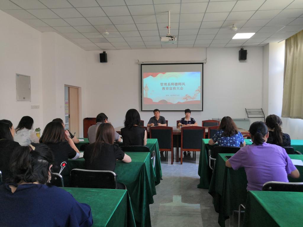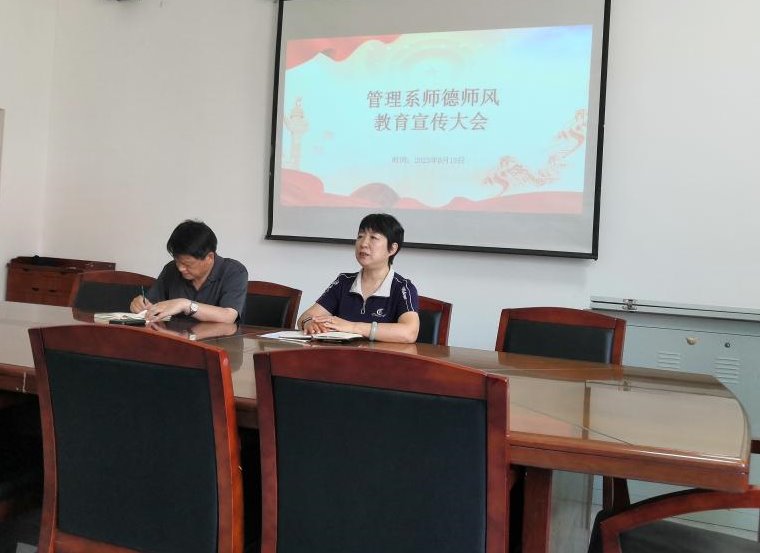 6月15日下午,管理系在知新1号楼235室召开师德师风教育宣传大会,并对下阶段工作进行了安排部署。管理系党总支书记刘建芹、系主任宋利伟出席会议,全体教职工参加会议。