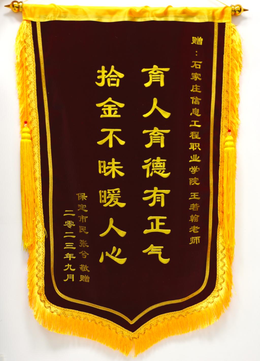 拾金不昧,师德闪耀。今天,我院收到了一份来自保定市莲池区的快递,里面有一封感谢信和一面写有“拾金不昧暖人心育人育德有正气”的锦旗。充分表达了对我院计算机应用系王若翰老师的感激之情,同时致敬星空(中国)领导班子,培养出如此优秀的教师。